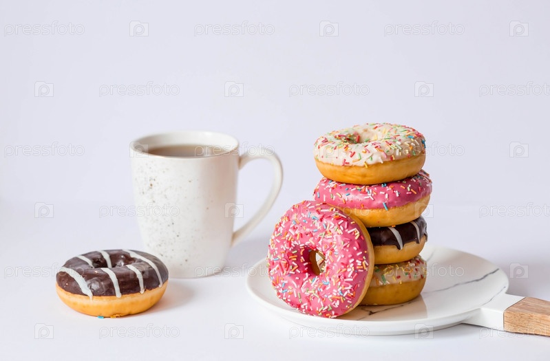 Вкусный десерт. Розовые, белые и шоколадные пончики с разноцветными брызгами, чашка черного кофе или чая. Сладости