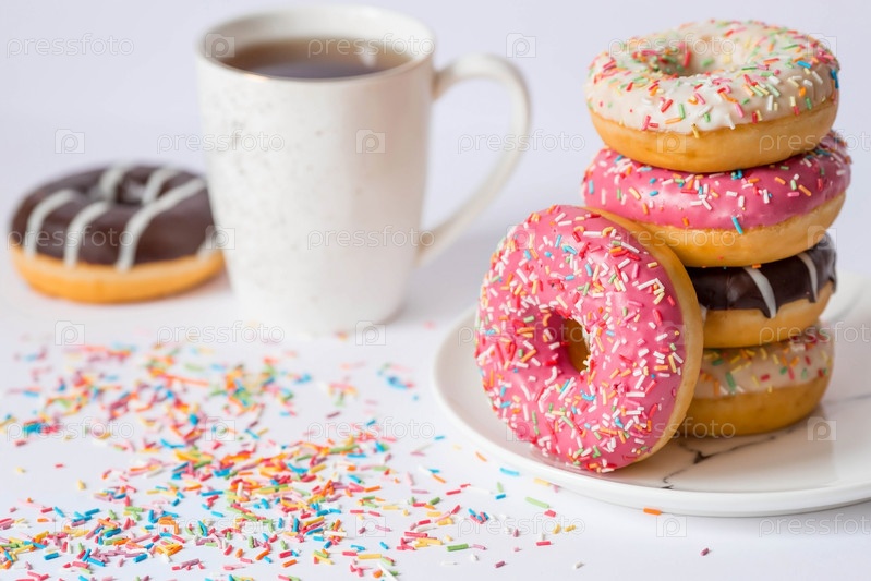 Вкусный десерт. Розовые, белые и шоколадные пончики с разноцветными брызгами, чашка черного кофе или чая. Сладости