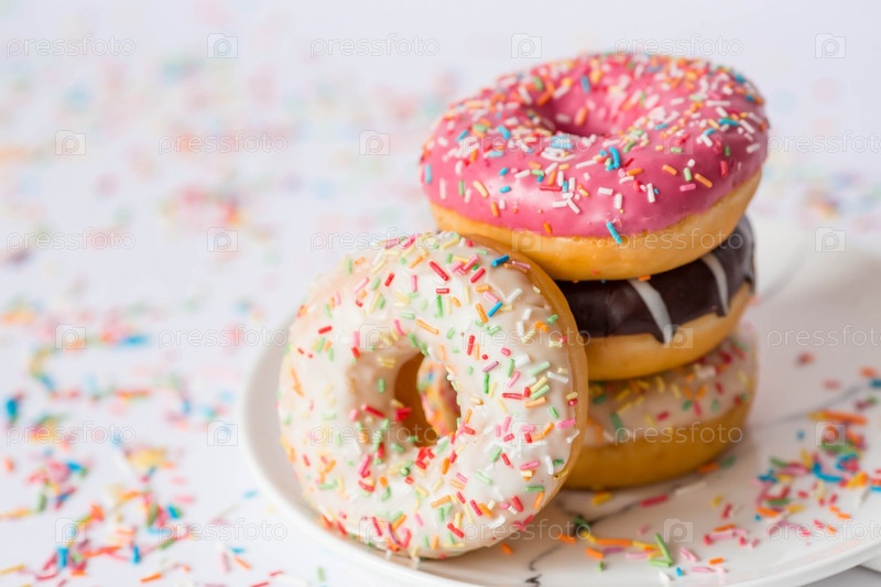 Вкусный десерт. Розовые, белые и шоколадные пончики с разноцветными брызгами на белом фоне сладостей. Кондитерские изделия