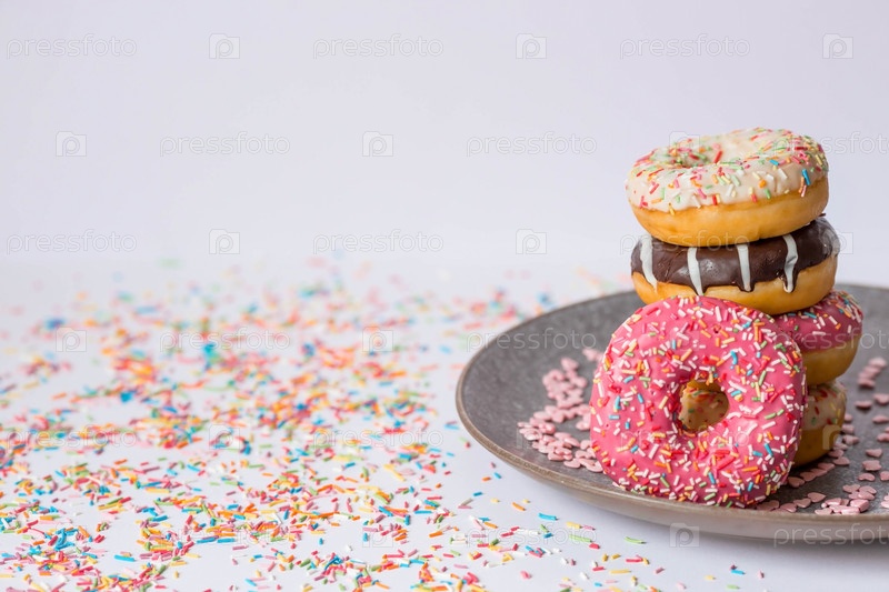 Вкусный десерт. Розовые, белые и шоколадные пончики с разноцветными брызгами на белом фоне сладостей. Кондитерские изделия