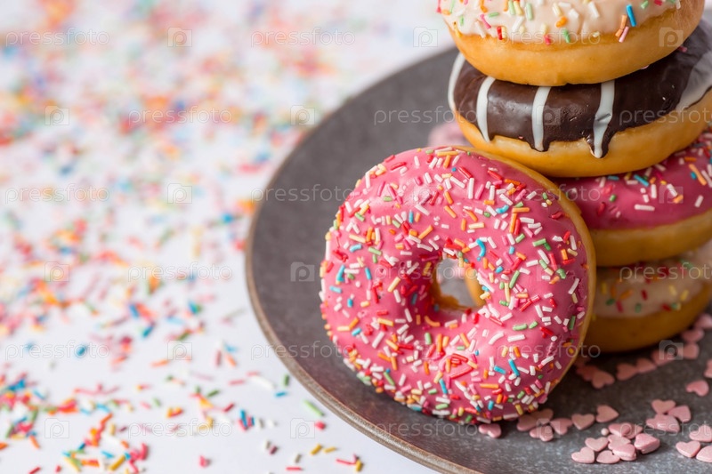 Вкусный десерт. Розовые, белые и шоколадные пончики с разноцветными брызгами на белом фоне сладостей. Кондитерские изделия