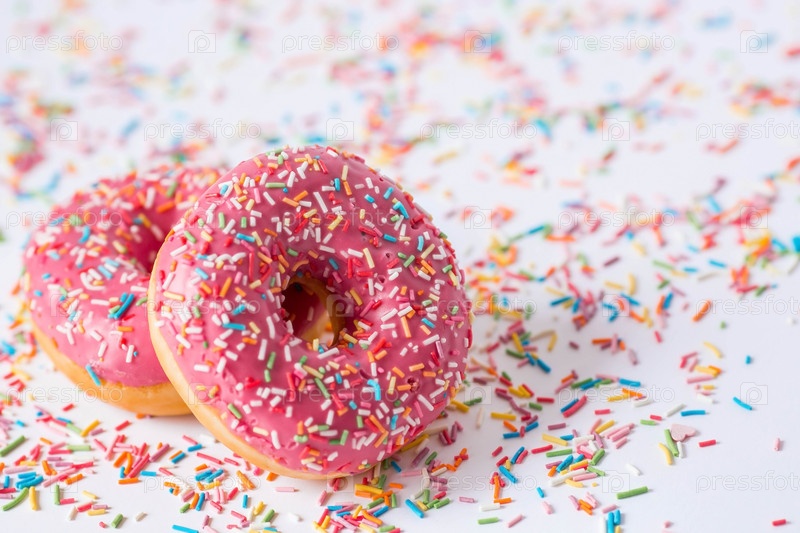 Вкусный десерт. Розовый пончик с разноцветными брызгами на белом фоне сладостей. Кондитерские изделия