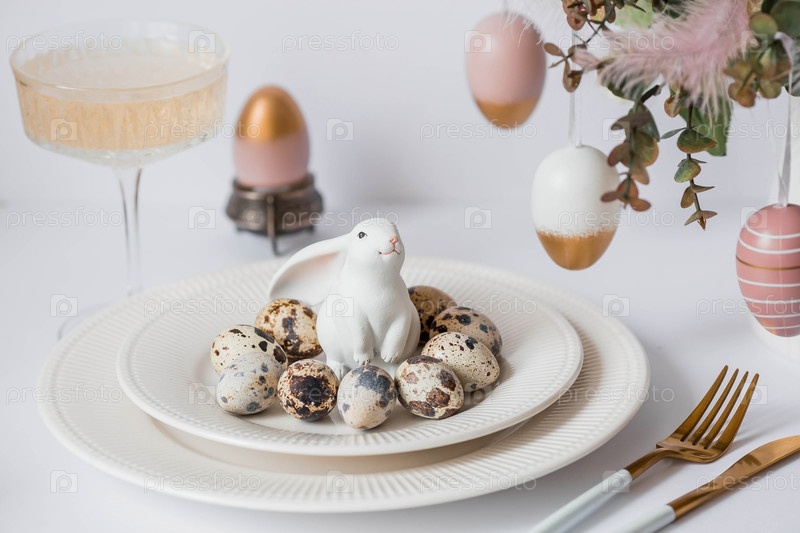 Баннер. Концепция светлого праздника Пасхи. Букет цветов с перьями, белыми кроликами и пасхальными яйцами в тарелке на белом изолированном фоне. Красивая пасхальная открытка