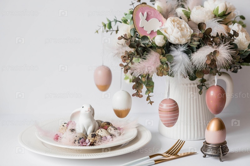 Баннер. Концепция светлого праздника Пасхи. Букет цветов с перьями, белыми кроликами и пасхальными яйцами в тарелке на белом изолированном фоне. Красивая пасхальная открытка