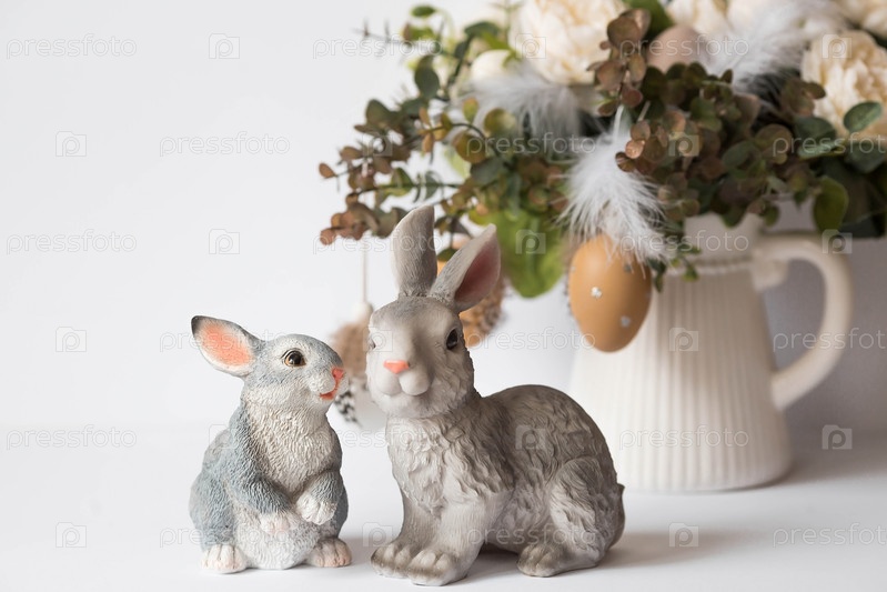 Баннер. Концепция светлого праздника Пасхи. Букет цветов с перьями, серыми кроликами и пасхальными яйцами на белом изолированном фоне. Красивая пасхальная открытка