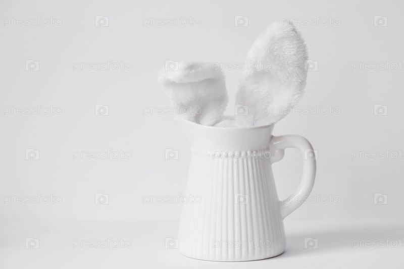 Баннер. Концепция праздника. Белый кувшин с торчащими заячьими ушами на белом изолированном фоне. Красивая пасхальная открытка
