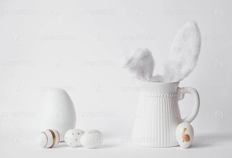 Баннер. Концепция праздника. Пасхальные яйца, белый кувшин с торчащими кроличьими ушами на белом изолированном фоне. Красивая пасхальная открытка