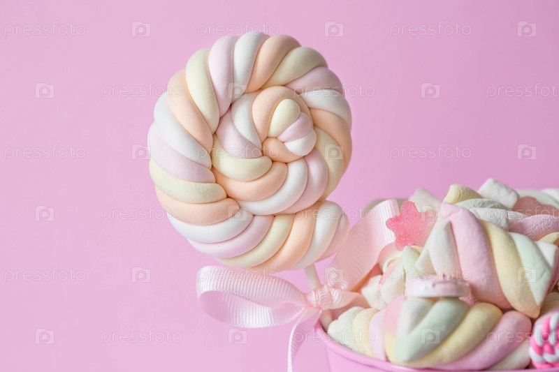 Зефир. Жевательные конфеты крупным планом на розовом фоне. Десерт из сладких блюд в розовом ведре. Пастельные цвета. Копия текстового пространства