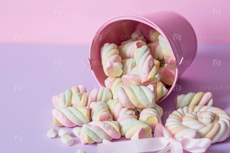 Зефир. Жевательные конфеты крупным планом на розовом фоне. Десерт из сладких блюд в розовом ведре. Пастельные цвета. Копия текстового пространства