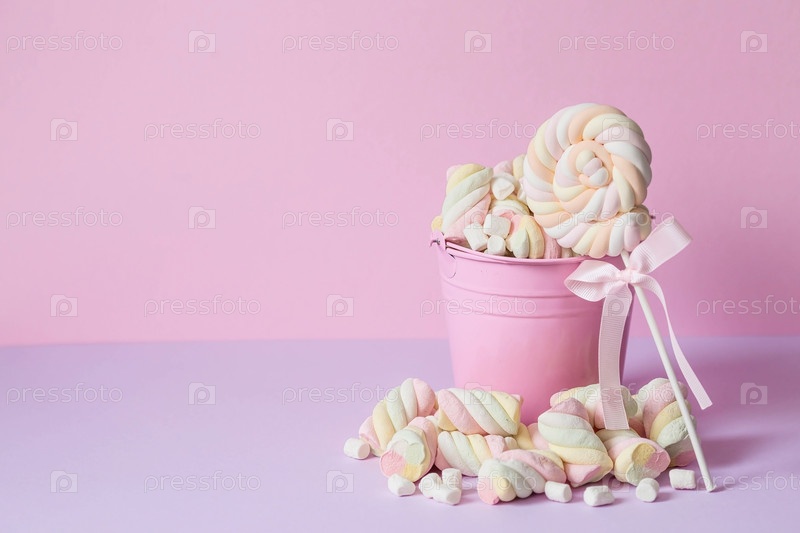 Зефир. Жевательные конфеты крупным планом на розовом фоне. Десерт из сладких блюд в розовом ведре. Пастельные цвета. Копия текстового пространства