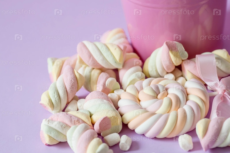 Зефир. Жевательные конфеты крупным планом на розовом фоне. Десерт из сладких блюд в розовом ведре. Пастельные цвета. Копия текстового пространства