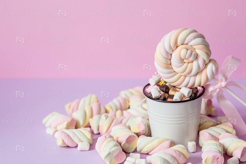 Зефир. Жевательные конфеты крупным планом на розовом фоне. Десерт сладких блюд в белом ведре. Пастельные цвета. Копия текстового пространства