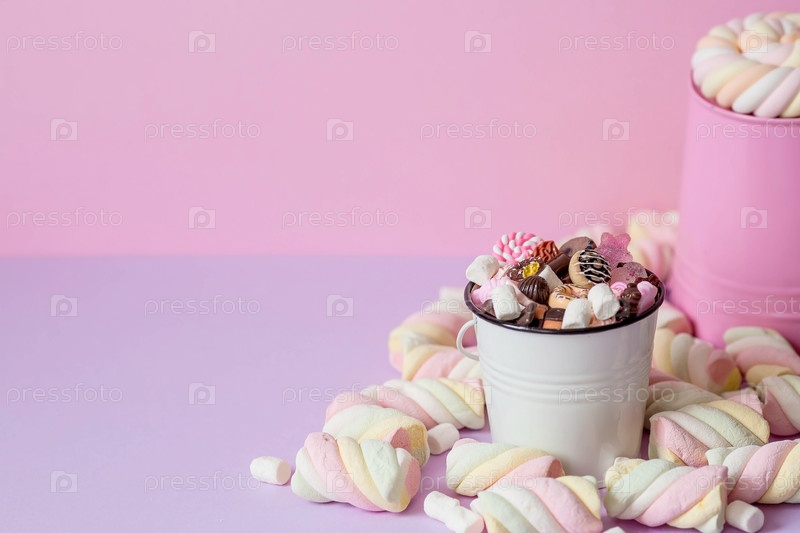 Зефир. Жевательные конфеты крупным планом на розовом фоне. Десерт сладких блюд в белом ведре. Пастельные цвета. Копия текстового пространства
