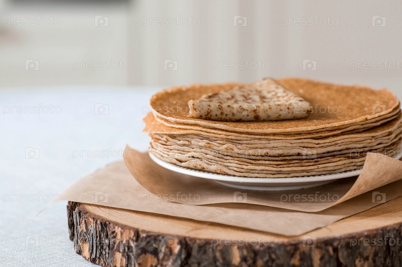 Русские традиции. Русский праздник Масленица. Натюрморт со стопкой блинов на деревянной подставке