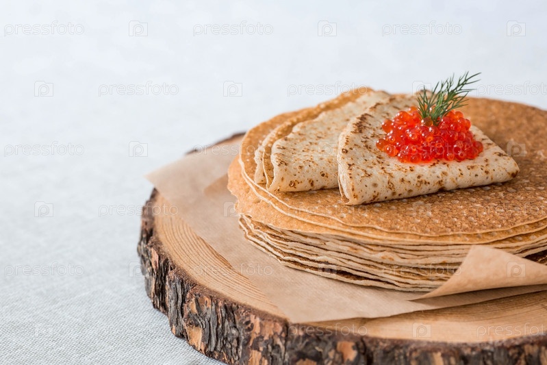 Русские традиции. Русский праздник Масленица. Натюрморт со стопкой блинов, красной икрой, лимоном и веточкой укропа