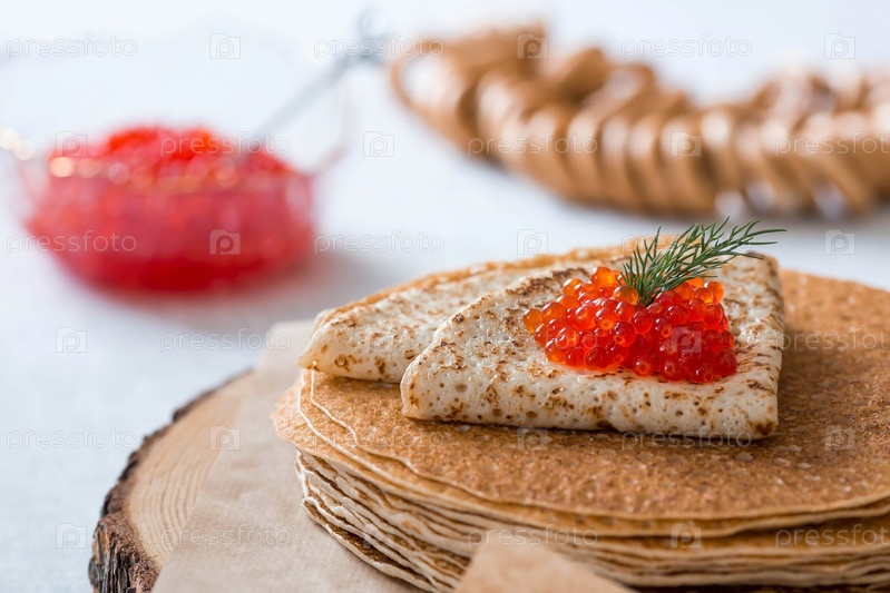 Русские традиции. Русский праздник Масленица. Натюрморт со стопкой блинов, красной икрой, лимоном и веточкой укропа
