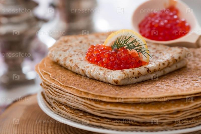 Русские традиции. Русский праздник Масленица. Натюрморт с чашкой чая, стопкой блинов, красной икрой, лимоном, рогаликами, петушка-леденцом, деревянными ложками (хохломой) и самоварами