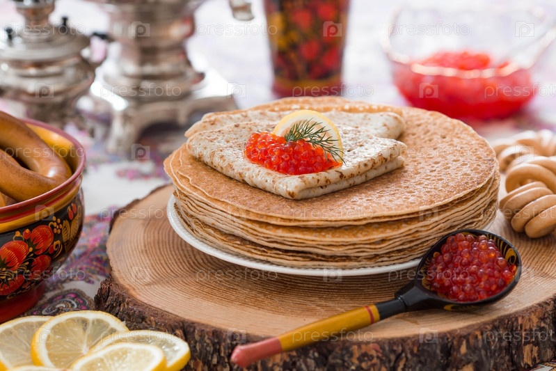 Русские традиции. Русский праздник Масленица. Натюрморт с чашкой чая, стопкой блинов, красной икрой, лимоном, рогаликами, петушка-леденцом, деревянными ложками (хохломой) и самоварами