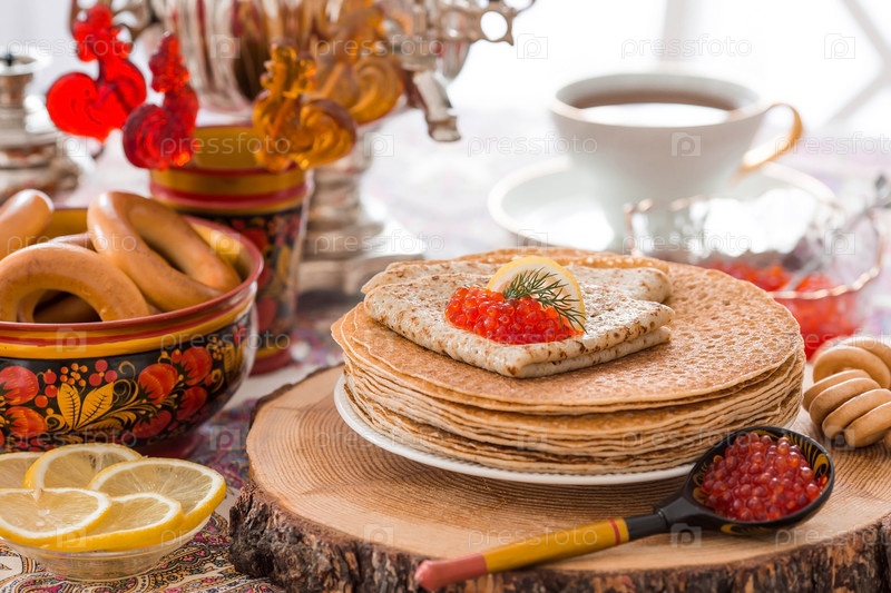 Русские традиции. Русский праздник Масленица. Натюрморт с чашкой чая, стопкой блинов, красной икрой, лимоном, рогаликами, петушка-леденцом, деревянными ложками (хохломой) и самоварами