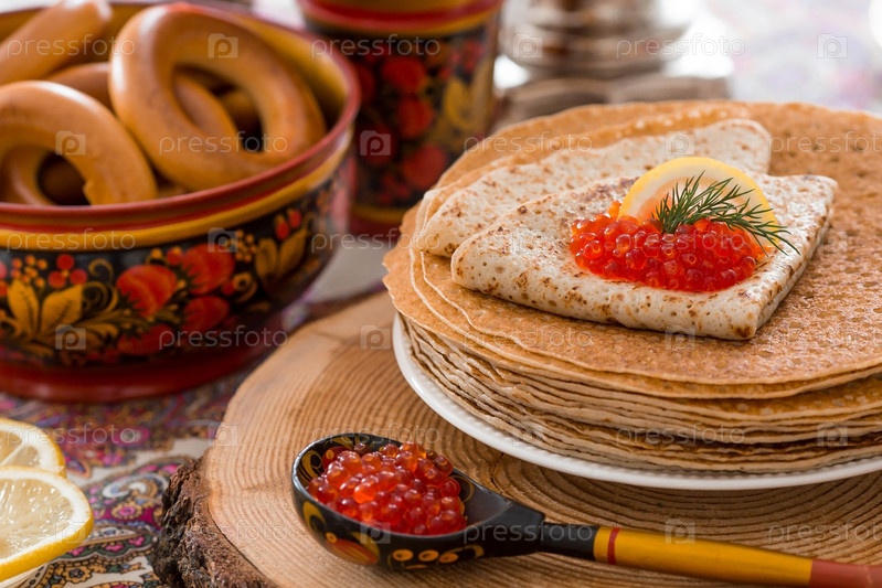 Русские традиции. Русский праздник Масленица. Натюрморт с чашкой чая, стопкой блинов, красной икрой, лимоном, рогаликами, петушка-леденцом, деревянными ложками (хохломой) и самоварами