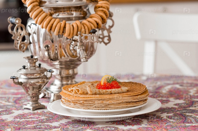 Русские традиции. Русский праздник Масленица. Натюрморт со стопкой блинов, красной икрой, лимоном и самоварами