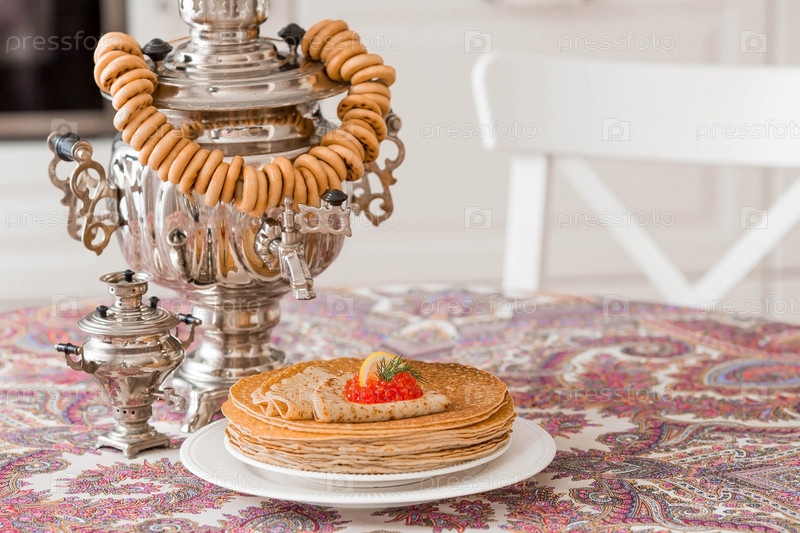 Русские традиции. Русский праздник Масленица. Натюрморт со стопкой блинов, красной икрой, лимоном и самоварами