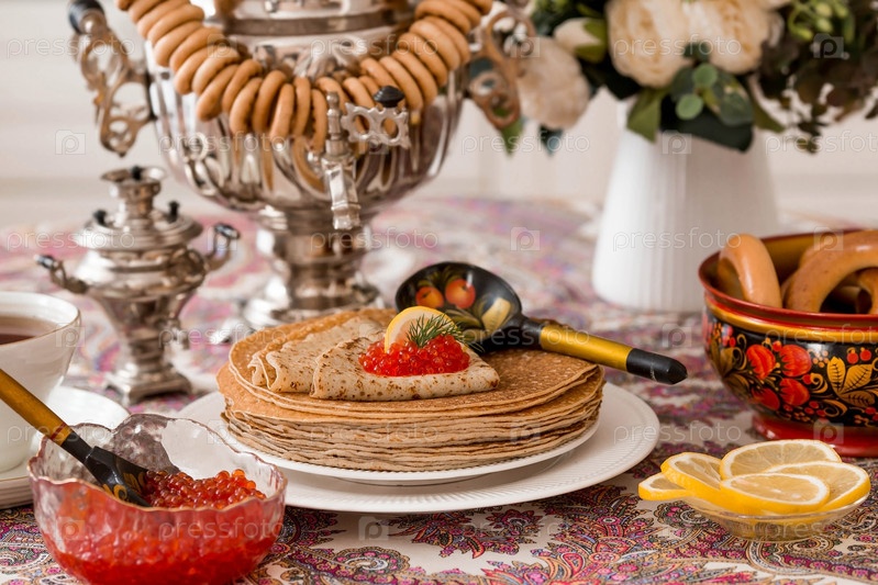 Русские традиции. Русский праздник Масленица. Натюрморт с чашкой чая, стопкой блинов, красной икрой, лимоном, рогаликами, петушка-леденцом, деревянными ложками (хохломой) и самоварами