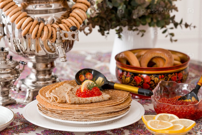 Русские традиции. Русский праздник Масленица. Натюрморт с чашкой чая, стопкой блинов, красной икрой, лимоном, рогаликами, петушка-леденцом, деревянными ложками (хохломой) и самоварами
