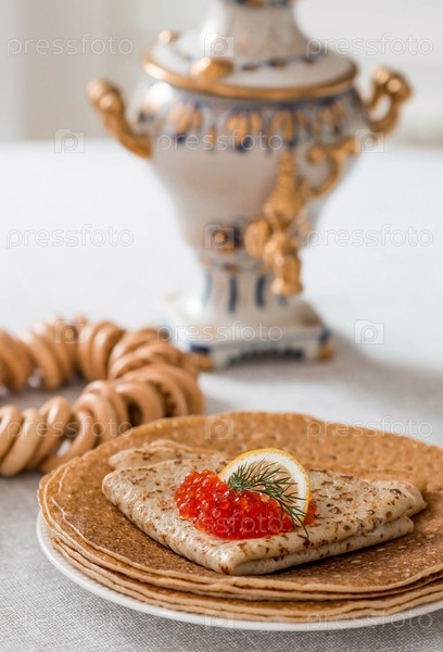 Русские традиции. Русский праздник Масленица. Натюрморт со стопкой блинов с красной икрой, баранками и самоваром в стиле гжель