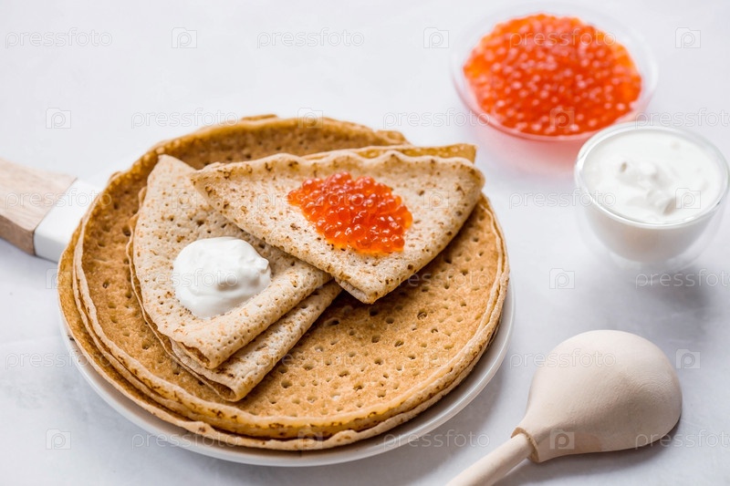 Русские традиции. Широкая Масленица. Пачка блинов, сметаны и красной икры на светлом фоне. Крупный план