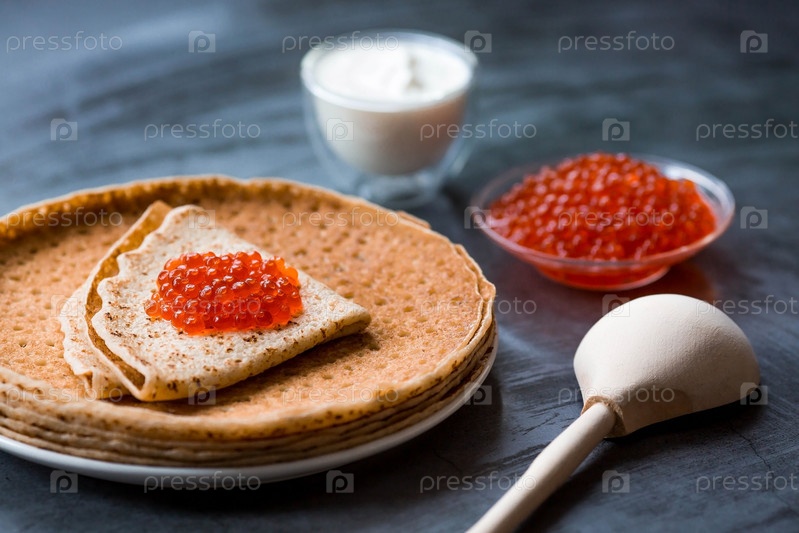 Русские традиции. Широкая Масленица. Стопка блинов, сметаны и красной икры на темном фоне. Крупный план