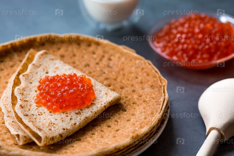 Русские традиции. Широкая Масленица. Стопка блинов, сметаны и красной икры на темном фоне. Крупный план