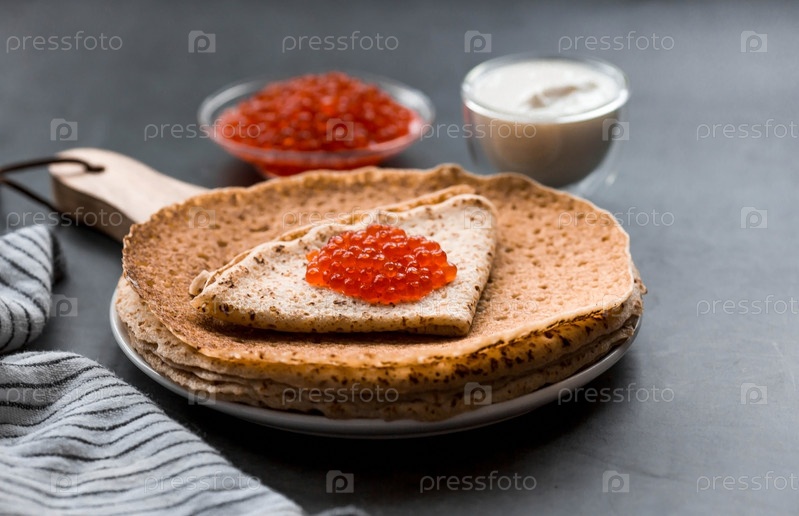 Русские традиции. Широкая Масленица. Стопка блинов, сметаны и красной икры на темном фоне. Крупный план