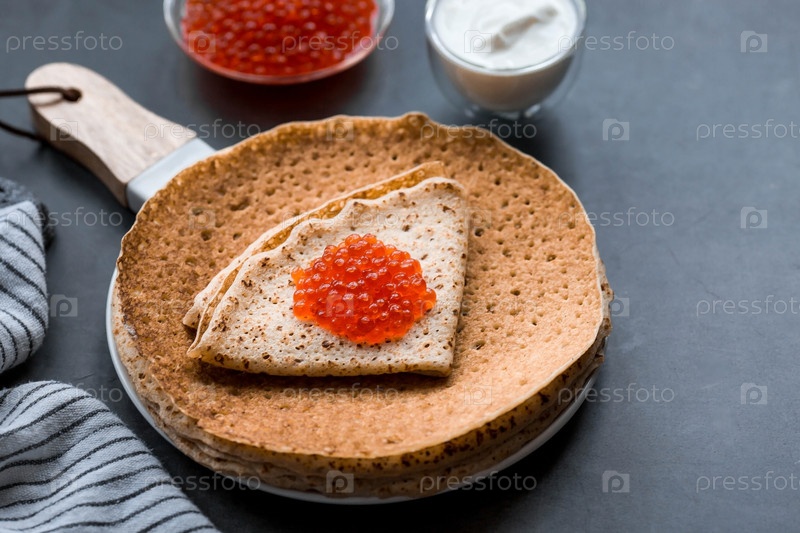 Русские традиции. Широкая Масленица. Стопка блинов, сметаны и красной икры на темном фоне. Крупный план