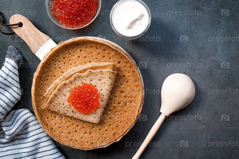 Русские традиции. Широкая Масленица. Стопка блинов, сметаны и красной икры на темном фоне. Крупный план
