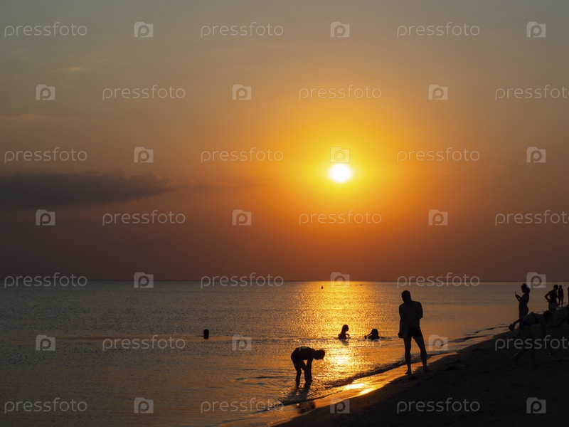 Удивительный закат на пляже летом. Вид на морской закат с силуэтами отдыхающих на берегу. Оранжевый закат с отражением в поверхности моря. Пляжный отдых и туризм