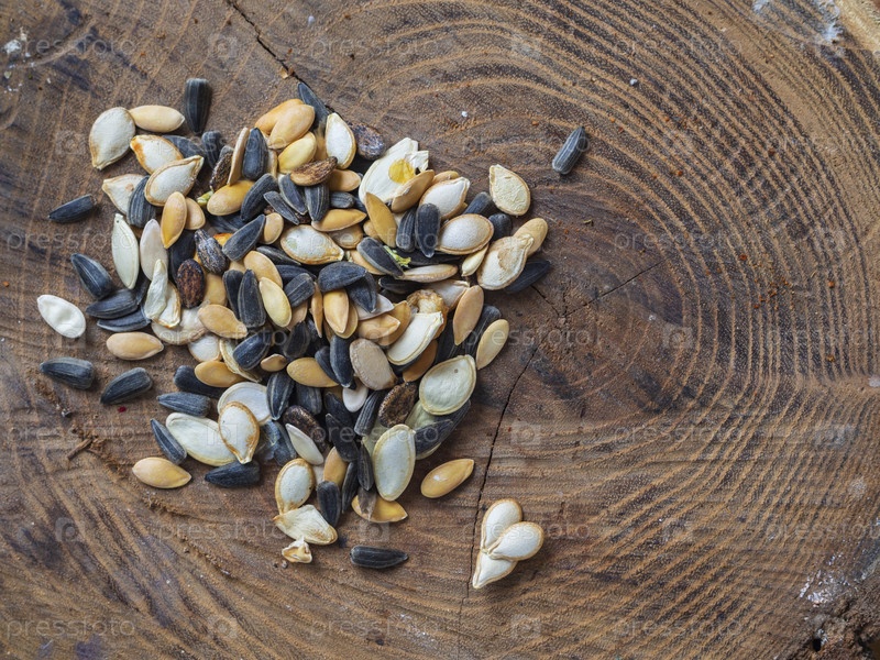 Смешанные семена крупным планом на фоне темного дерева. Семена подсолнуха и тыквы на деревянной доске, вид сверху