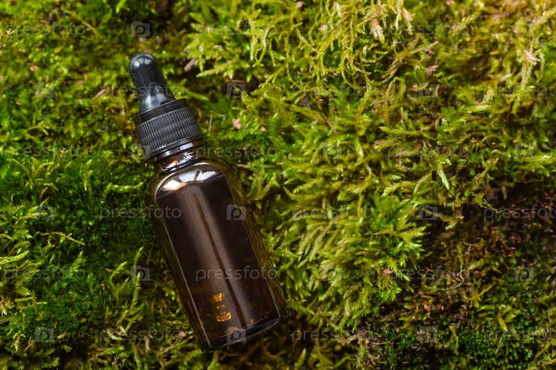 Ароматерапия. Стеклянная бутылка с пипеткой для масла и лосьона на бетонном фоне лежала сверху. Натуральная органическая экокосметика. Макет брендинга салона красоты