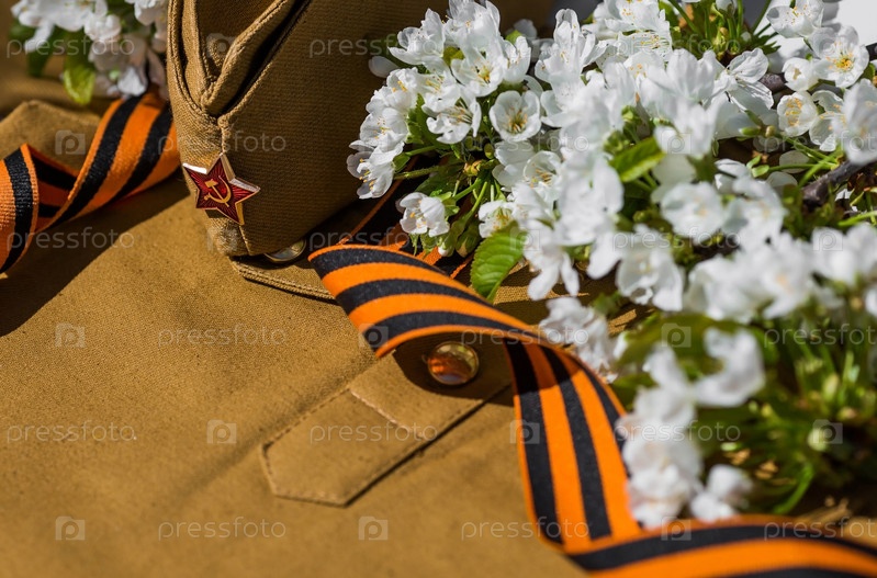 Знамя к 9 Мая. Военная форма, фуражка со звездой, георгиевской лентой и цветком сакуры на заднем плане. Концепция Дня Великой Победы 941-1945 гг. и Дня защитника Отечества