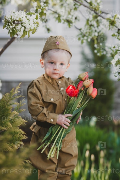 9 мая. Маленький мальчик 2 лет в военной форме с букетом красных тюльпанов на фоне цветущей сакуры. Концепция Дня Великой Победы 1941-1945 гг. и Дня защитника Отечества
