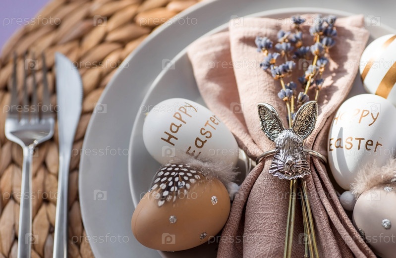 Баннер. Сервировка стола. Тарелка с кроликом на салфетке, лавандой и пасхальными яйцами на модном фоне 2022 года — это очень красиво. Вид сверху. Концепция счастливого пасхального праздника для кафе и ресторанов