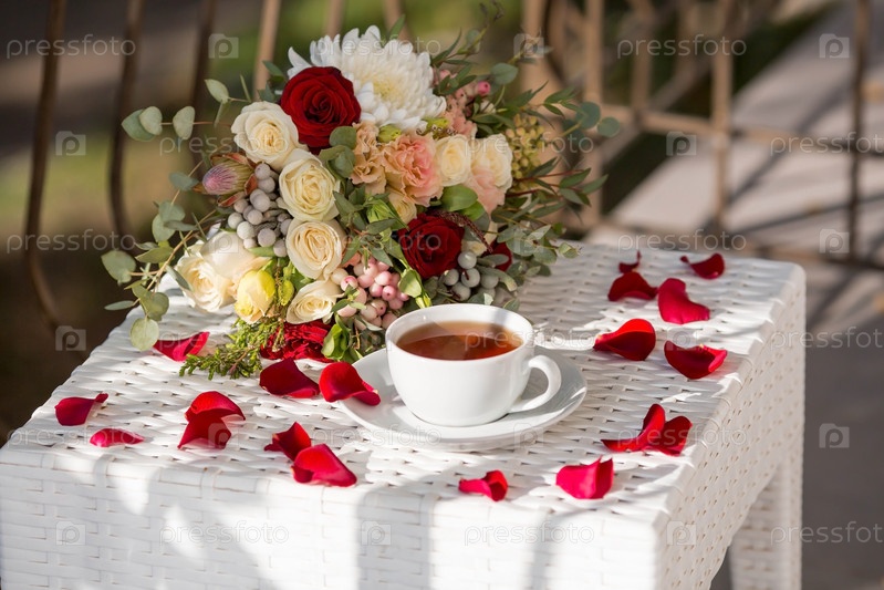 Баннер. Чашка чая, лепестки роз, золотые обручальные кольца и красивый букет на белом столе. Концепция свадебного торжества. Утро невесты