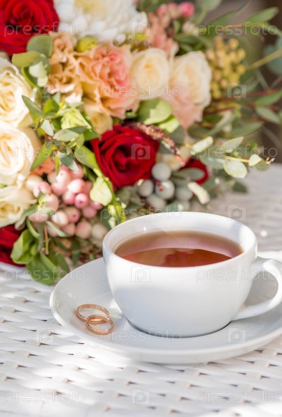 Баннер. Чашка чая, лепестки роз, золотые обручальные кольца и красивый букет на белом столе. Концепция свадебного торжества. Утро невесты
