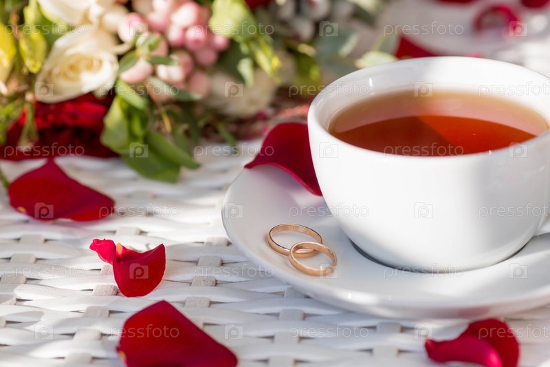 Баннер. Чашка чая, лепестки роз, золотые обручальные кольца и красивый букет на белом столе. Концепция свадебного торжества. Утро невесты