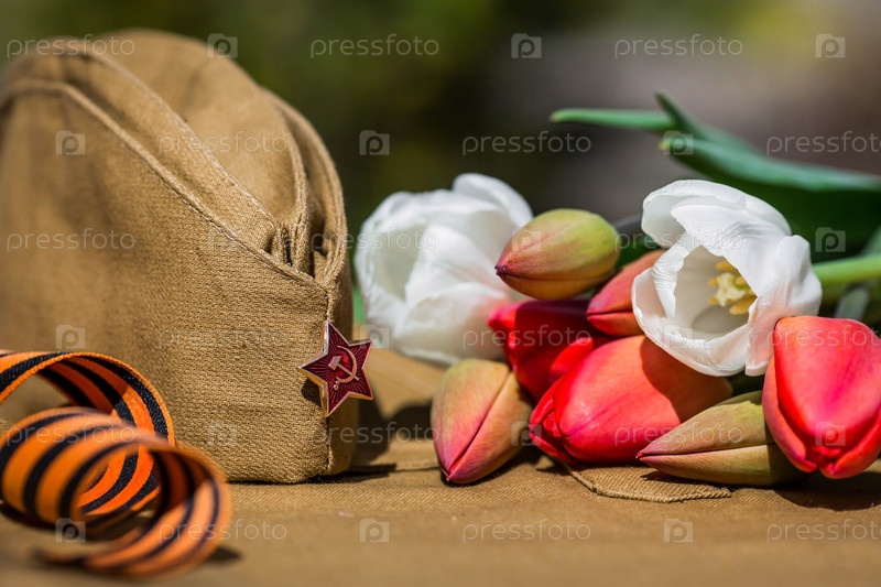 Знамя на 9 мая. Военная форма, фуражка со звездой, георгиевская лента и красные тюльпаны на заднем плане. Концепция Дня Великой Победы 941-1945 гг. и Дня защитника Отечества