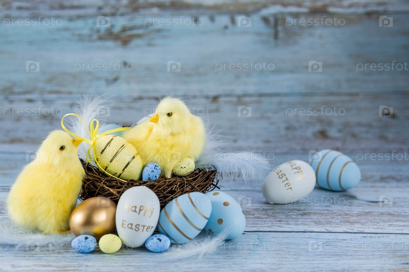 Синие, желтые, белые яйца в гнезде и желтые цыплята на синем деревянном фоне. Минимальная концепция. Пасхальная открытка с копией места для текста
