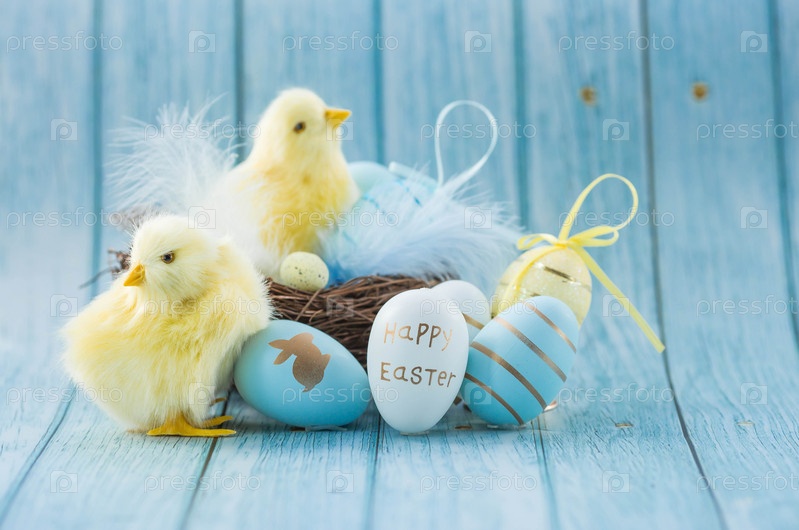 Синие, желтые, белые яйца в гнезде и желтые цыплята на синем деревянном фоне. Минимальная концепция. Пасхальная открытка с копией места для текста