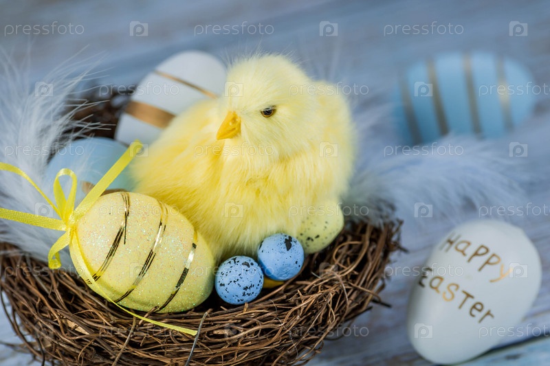 Синие, желтые, белые яйца в гнезде и желтые цыплята на синем деревянном фоне. Минимальная концепция. Пасхальная открытка с копией места для текста