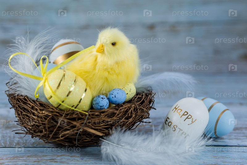 Синие, желтые, белые яйца в гнезде и желтые цыплята на синем деревянном фоне. Минимальная концепция. Пасхальная открытка с копией места для текста
