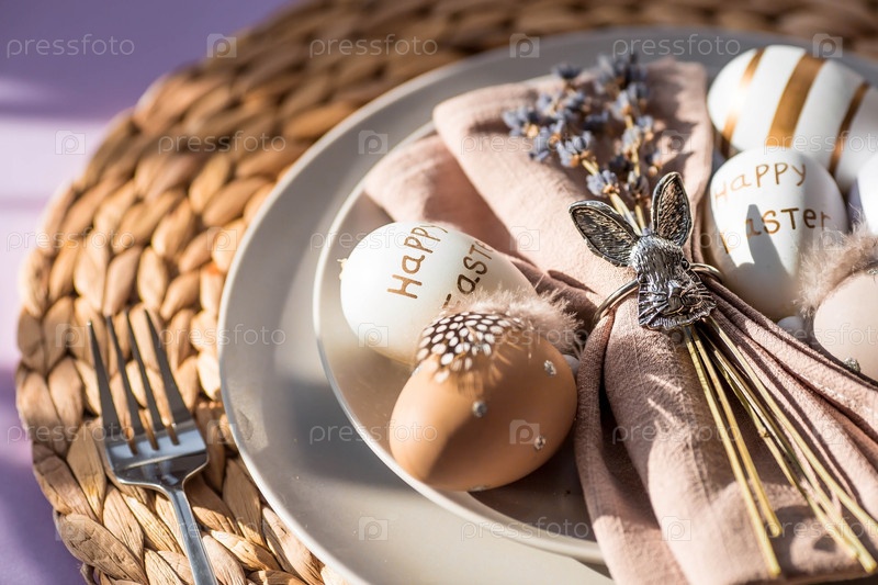 Баннер. Сервировка стола. Тарелка с кроликом на салфетке, лавандой и пасхальными яйцами на модном фоне 2022 года — это очень красиво. Вид сверху. Концепция счастливого пасхального праздника для кафе и ресторанов